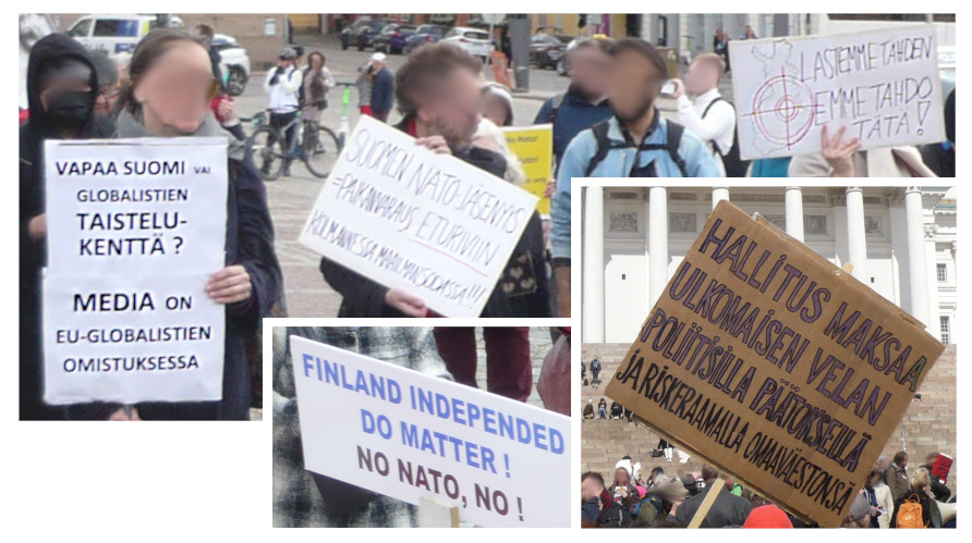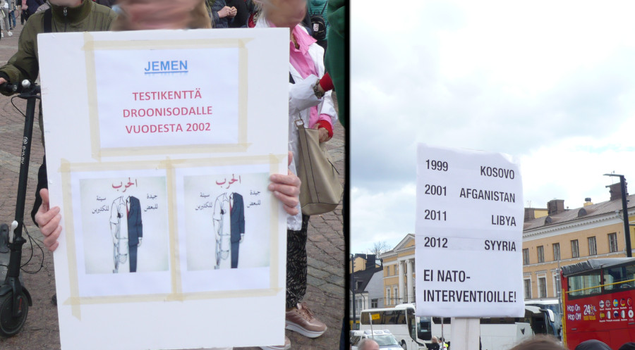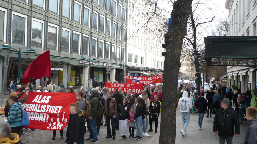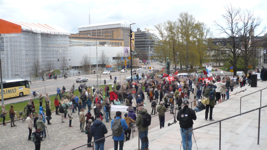 Joitain satoja ihmisiä kokoontui sunnuntaina 15.5. Helsingissä osoittamaan mieltään NATO:a vastaan. Mielenosoituskulkue lähti liikkeelle Senaatintorilta, kulki Esplanadin kautta Mannerheimintielle ja päättyi Eduskuntatalolla pidettyihin puheisiin.