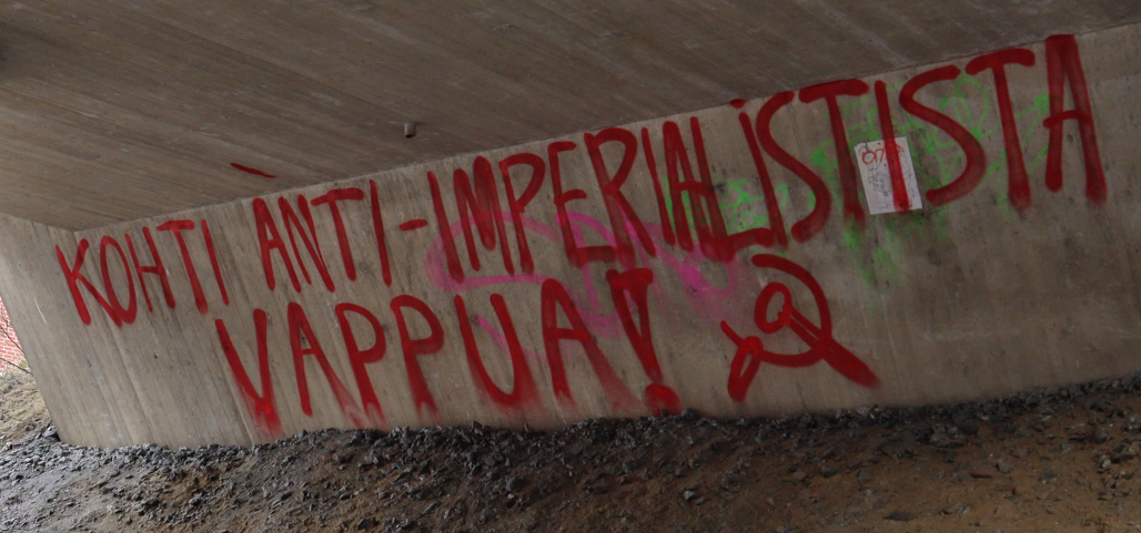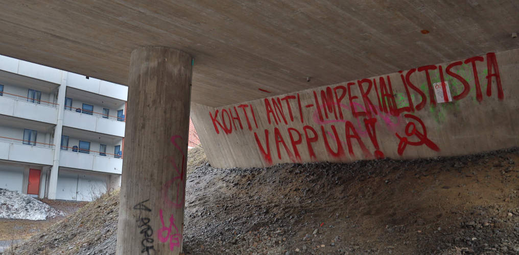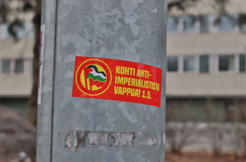 Dokumentoimme Tampereella tehdyn seinämaalauksen tekstillä “Kohti anti-imperialistista vappua!”, sekä levitetyn tarran.