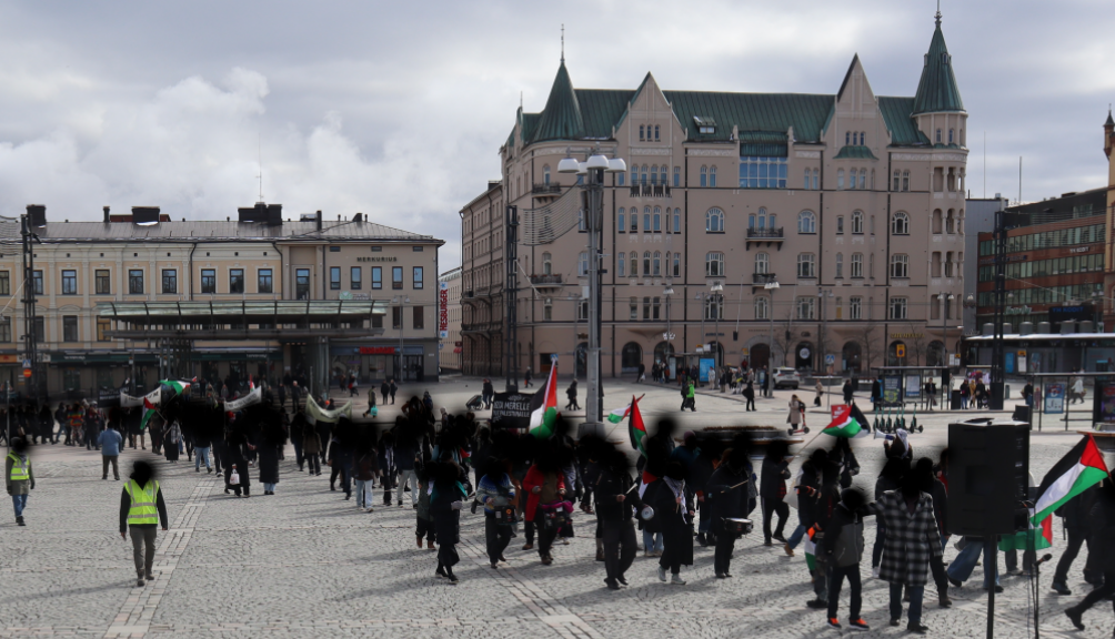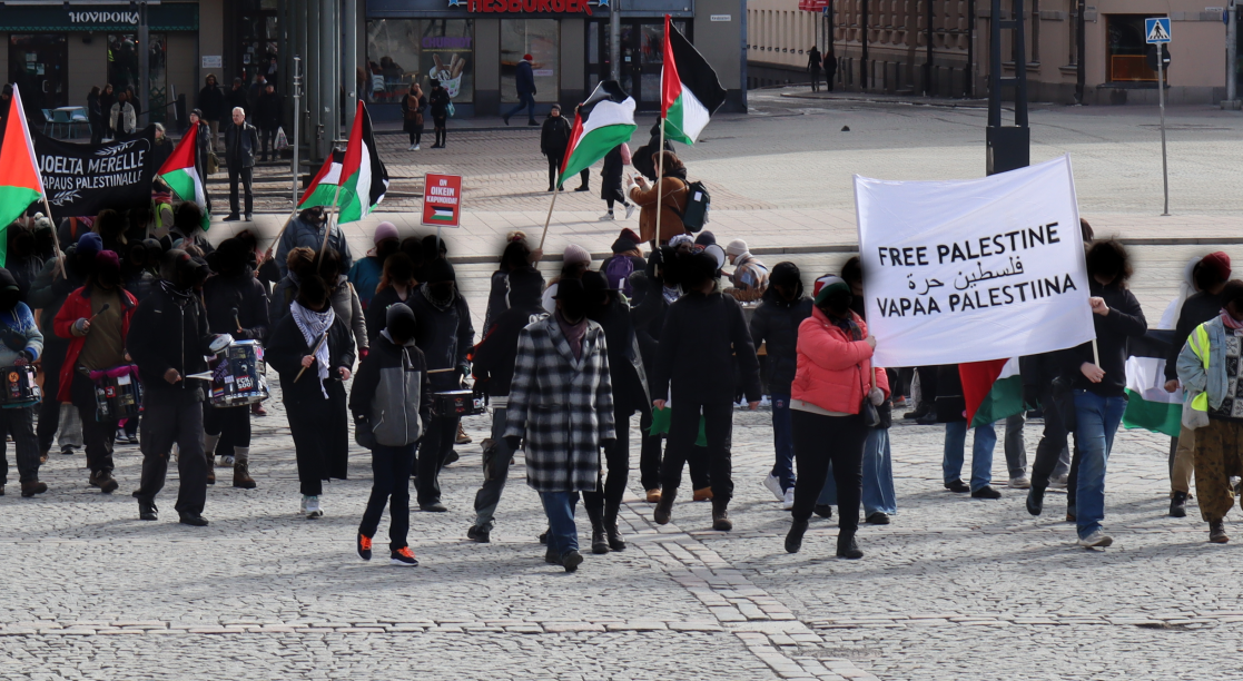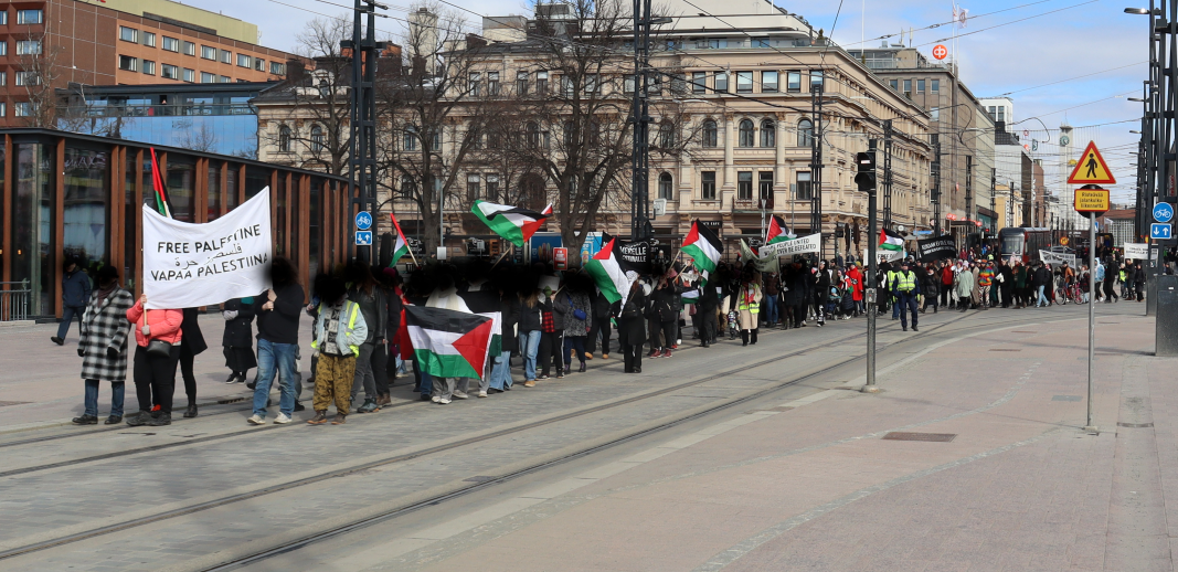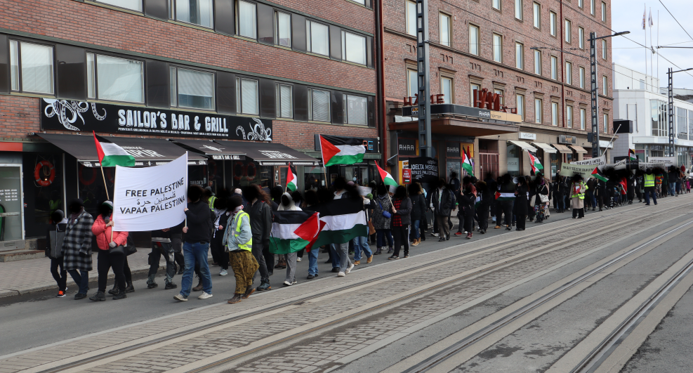 Sunnuntaina 21.4. oli jälleen Palestiina-solidaarisuusmielenosoitus. Takatalvi oli jo enimmäkseen väistynyt, mutta tuuli kävi kylmänä mielenosoituksen aloitellessa Sorin aukiolla. Mielenosoitus marssi kulkueena keskustan läpi ja matkalla lisää liittyi väkeen. Keskustorilla kuultiin puheita, runoesitys ja huutoja, sekä pidettiin hiljainen hetki marttyyreille.