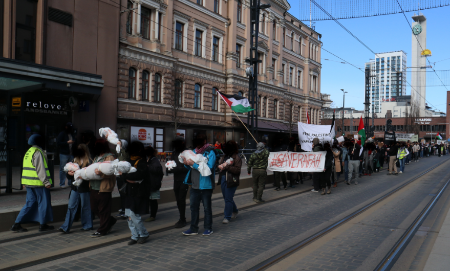 Tampereella oli torstaina 9. toukokuuta mielenosoitusmarssi Palestiinan puolesta, jonka ‘Tampere With Palestine’ (instagram & facebook: tamperewithpalestine) kutsui koolle Israelin Rafahiin kohdistuvan hyökkäyksen johdosta. Marssi keräsi satoja osallistujia huolimatta hyvin lyhyestä varoitusajasta, useiden liittyessä mukaan matkan varrelta.