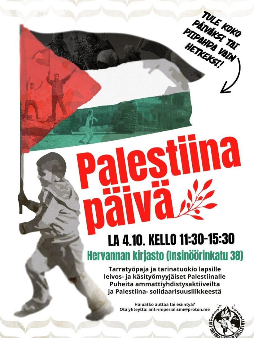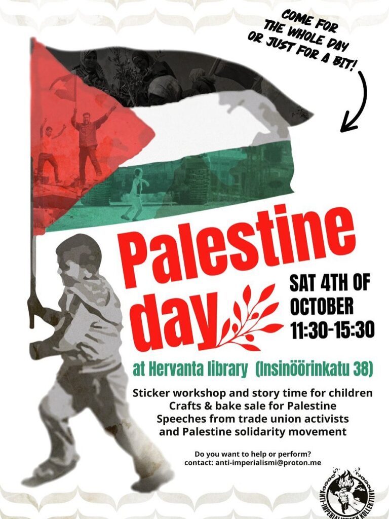 Welcome to Palestine Day at Hervanta library 4th of October starting from half past 11 am! There will be a sticker workshop and story time for children, crafts & bake sale for Palestine, as well as speeches from trade union activists and Palestine solidarity movement.