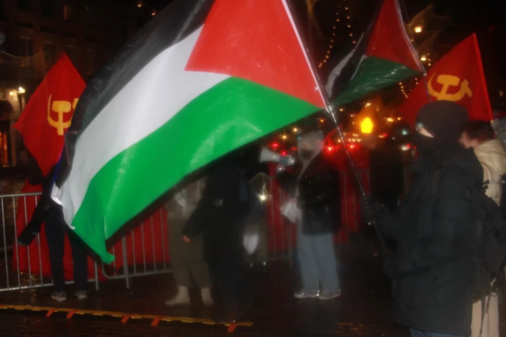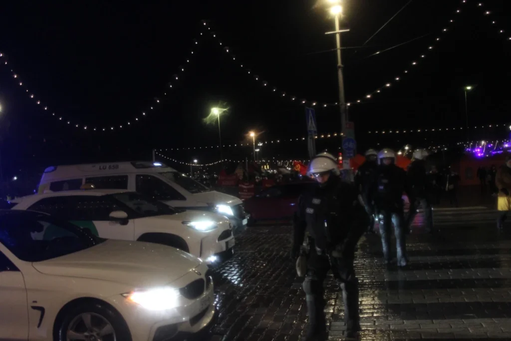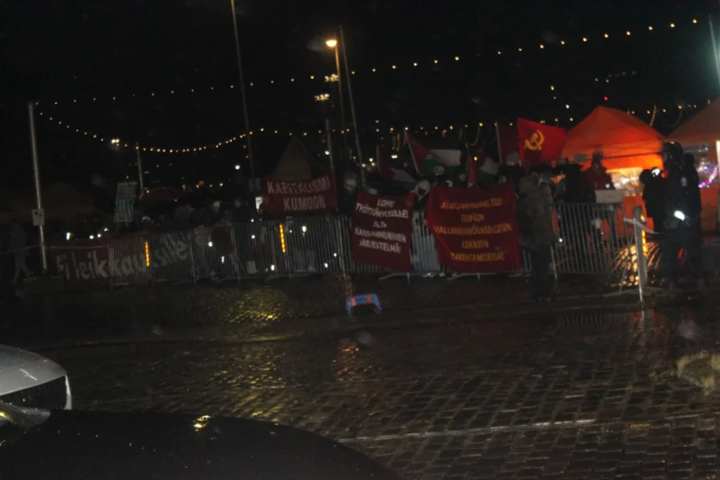 In addition, a demonstration of 30-50 people against Finnish imperialism was seen at the square. The Red Action took part under the slogan “Down with the butcher State! Forwards in the construction of the revolutionary movement!” and agitated against the Finnish State. The celebration was also opposed on the basis of Palestine solidarity. A banner with the slogan “Down with capitalism!” was also seen.