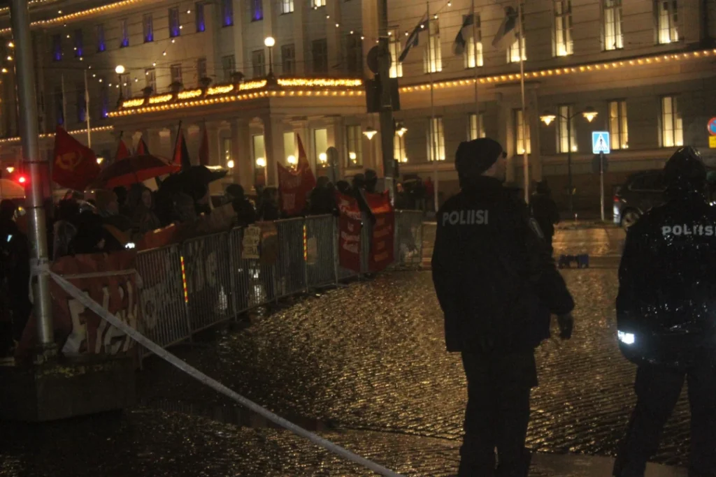 The police was heavily present at the President Castle. According to the reports we received, there were around 15-30 police and border patrol officers. Vehicles of the military police were also observed at the surrounding area. The streets leading to the Kauppatori had been blocked by the police. After an half an hour, the police encircled the peaceful rally and demanded it dispands without any justification. The demonstrators then made a controlled retreat with no losses. The right of assembly is a fundamental right, and the people have the right to exercise this right without permission from the police, even though the police often claims otherwise. The arbitrary dispersion of a completely peaceful demonstration criticizing the Finnish State and the constant worsening of the living conditions of the people with threats of violence shows what the bourgeois democracy truly is, the “freedom” Finnish imperialism boasts about, and which it claims to have defended in the World war II alongside Nazi-Germany against the Soviet Union.