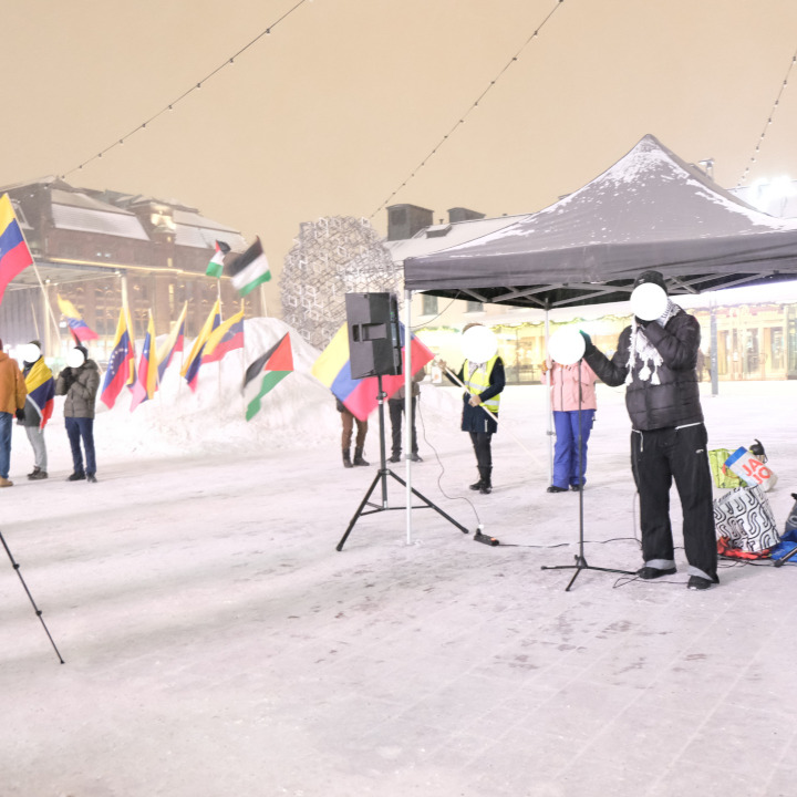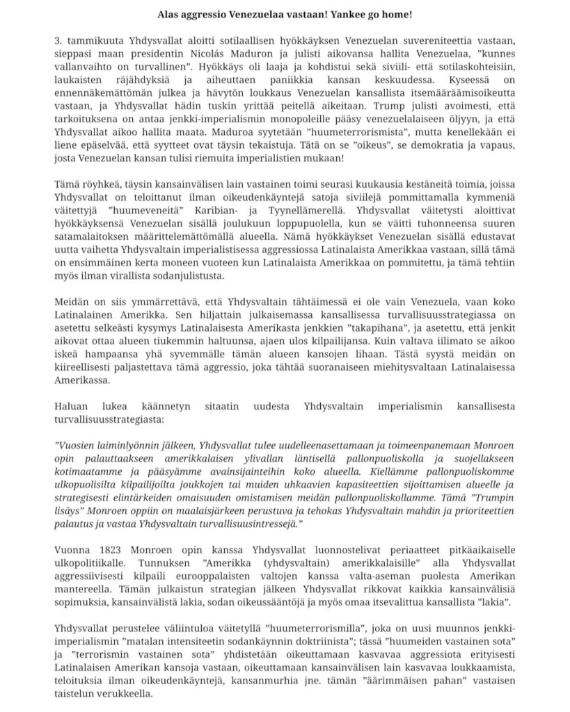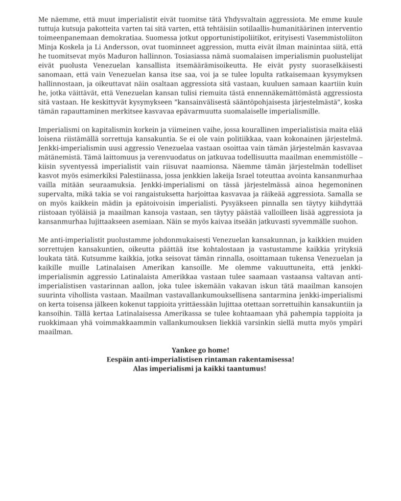 “6.1. olimme mukana osallistumassa ja järjestämässä anti-imperialistista mielenosoitusta vastauksena jenkki-imperialismin hyökkäykseen Venezuelaa vastaan. Osallistujia oli suurimmillaan noin 100-200, ja puheita kuultiin noin 20, sillä osallistujat olivat tarttuneet innolla avoimeen mikkiin. Puhessa kuultiin useiden eri anti-imperialististen ja vallankumouksellisten voimien kantoja. Niissä yleisesti tuomittiin voimakkaasti imperialistinen aggressio tietenkin Venezuelaa kohtaan mutta myös ainakin Iranin ja Palestiinan tilannetta käsiteltiin. Tässä yhteydessä myös paljastettiin ja tuomittiin suomalaisen imperialismin roolia tässä maailmanjärjestelmässä. Useissa puheissa tuotiin esille myös sitä, miten pääasia ei ole kauhistella Maduron hallintoa, vaan tuomita jenkki-imperialismin hyökkäys ja ymmärtää, että Venezuelan kansa, eikä jenkkien pommit, tulee vapauttamaan itsensä. Puheista tuli myös selväksi, että osallistujat haluavat tehdä enemmän tässä taistelussa, että emme tee tällä hetkellä tarpeeksi. Yleisesti puheiden kautta tuli selväksi, että monien eri voimien välillä vallitsi yhtenäisyyttä monessa kysymyksessä koskien anti-imperialismia, ja kun eräs puhuja tuli puolustamaan jenkkien interventiota, tämä yksimielisesti torjuttiin mielenosoittajien toimesta. Meidän puheemme löytyy kirjoitettuna seuraavassa julkaisussamme. Puheiden lisäksi kuulimme huutoja, joissa mm. vaadittiin vapautta ainakin Venezuelaan, Meksikoon, Palestiinaan, Iraniin, Kongoon ja Sudaniin. Kuulimme myös paljon imperialismin, varsinkin jenkki-imperialismin, vastaisia huutoja kuten “Yankee go home!”. Huutojen lisäksi kuulimme laulun, joka kehotti toimintaan Palestiinan puolesta. Mielenosoitus oli suuri menestys, ja saimme vaikutuksen, että on suurta halua järjestää samantapaisia mielenosoituksia lisää tulevaisuudessa. Odotamme innolla tulevia mielenosoituksia ja muita tapahtumia. Lämmin kiitos kaikille osallistujille ja muille järjestäjille!”