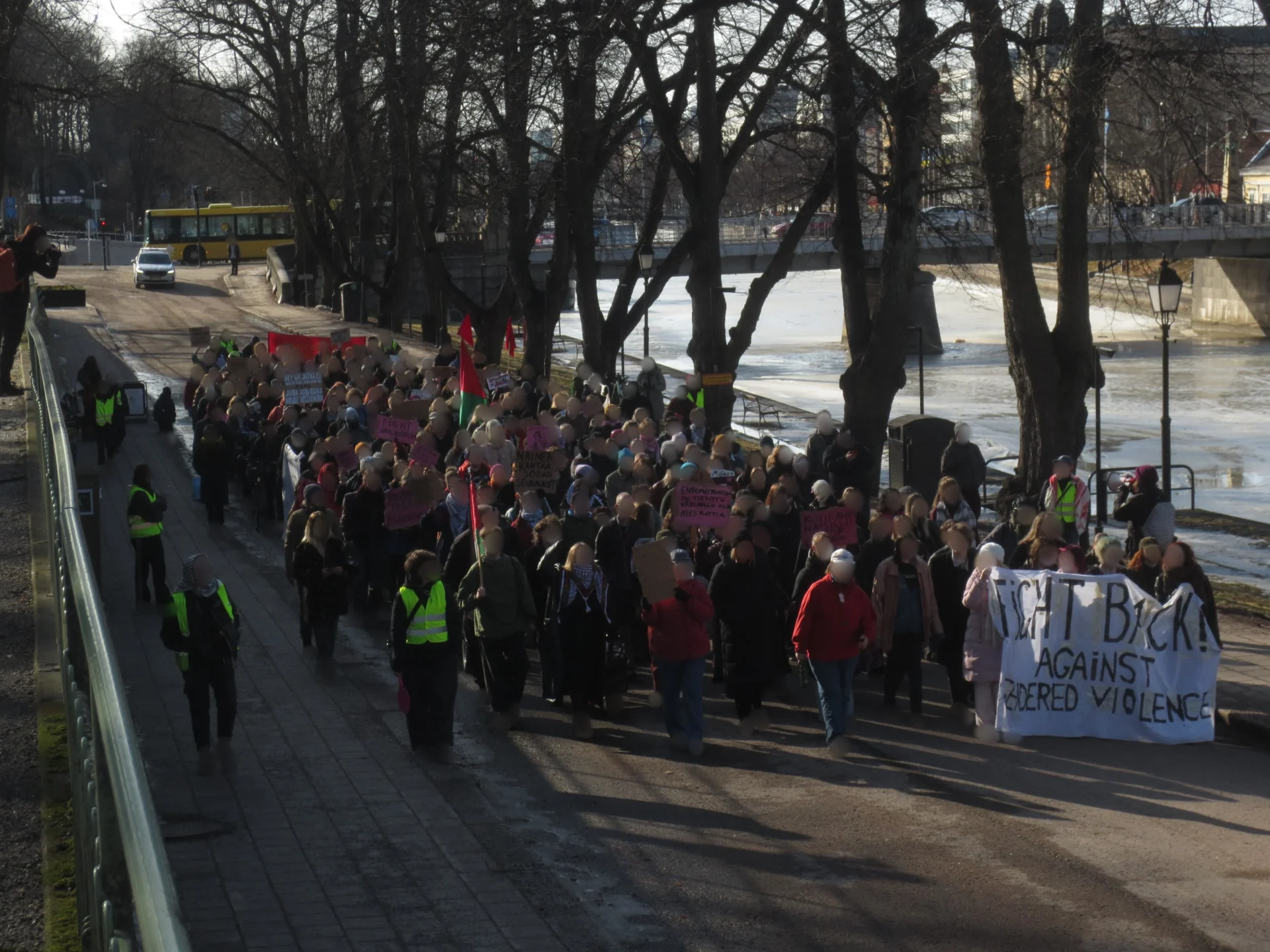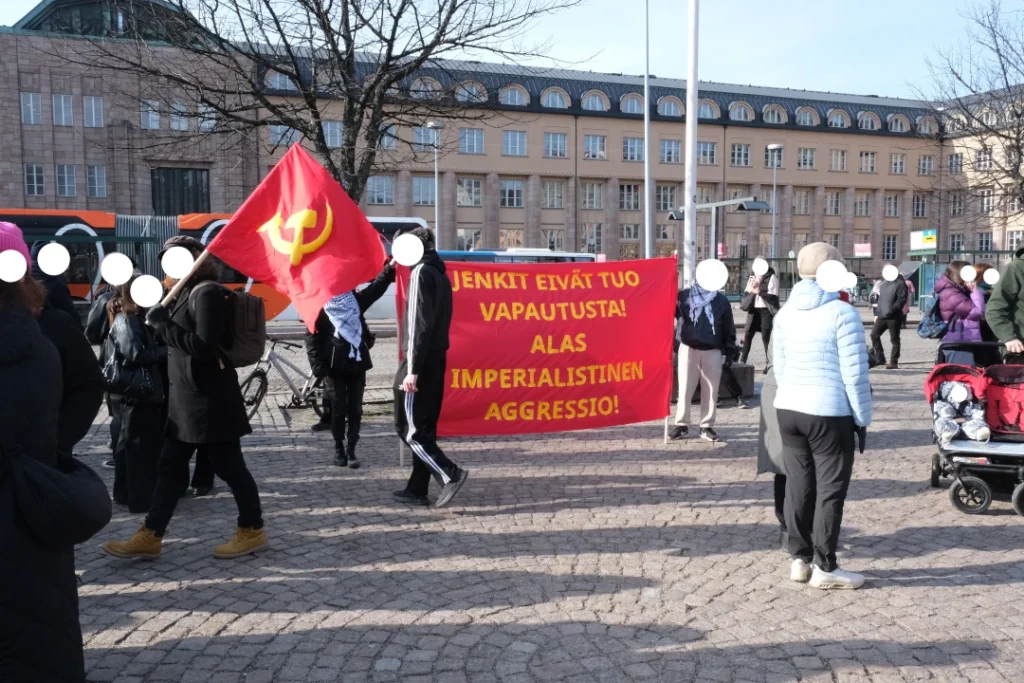 ”Kansainvälisenä Työtätekevien Naisten Päivänä 8.3.2026 osallistuimme anti-imperialistisessa blokissa mielenosoitusmarssille, jonka järjestäjänä oli yhdessä muiden ryhmien kanssa Kurdistanin Ystävät Tampere. Blokkimme banderolli (”jenkit eivät tuo vapautusta – alas imperialistinen aggressio!”) kannettiin kulkueen mukana Rautatienkadulta keskustorille. Kansainvälisen Työtätekevien Naisten Päivän pysyvät perusvaatimukset imperialistisen sodan vastustamisesta ja leivästä tulivat blokkimme tunnuksissa yhdistyneinä tähän päivään, erityisesti protestoidessamme jenkkien ja sionistien sotaa Iranin alistamiseksi. Anti-imperialistiseen blokkiin liittyi matkan varrelta spontaanisti osallistujia, ainakin jenkki- ja sionistivastaisuuden johdosta. Edellisvuodesta poiketen (mistä raportoimme), väkivaltaiset taantumukselliset pysyivät loitolla. Keskustorilla muutaman, mielenosoitusalueen ulkopuolella pitäytyneen jenkki-/sionistimielisen irvokas riekunta hukkui anti-imperialistiseen sanomaan. Lopuksi monet blokistamme kokoontuivat lyhyeen puhetilaisuuteen Koskipuistossa. Puheita kuuntelemaan jäi useita ohikulkijoita, jotka yksin vihaisena matkaansa jatkanutta pahlavistia lukuunottamatta olivat neutraaleja tai myötämielisiä. Uutiskynnyksen ylittänyt, Suomessa pahentunut naisvihamielinen väkivalta kaipaa myös kasvavissa määrin tuomiota laajoilta joukoilta. Lopuksi huudettiin vielä huutoja, kuten “jenkit ei tuo vapautusta, näpit irti Iranista” ja “parempaa palkkaa, työtä kaikille!”.
