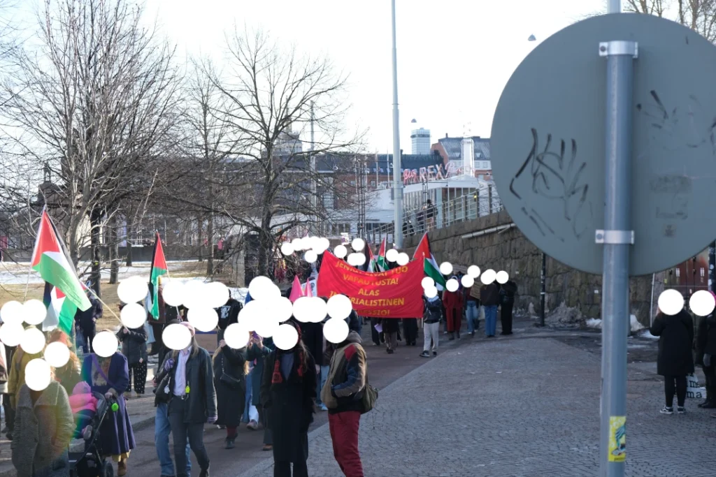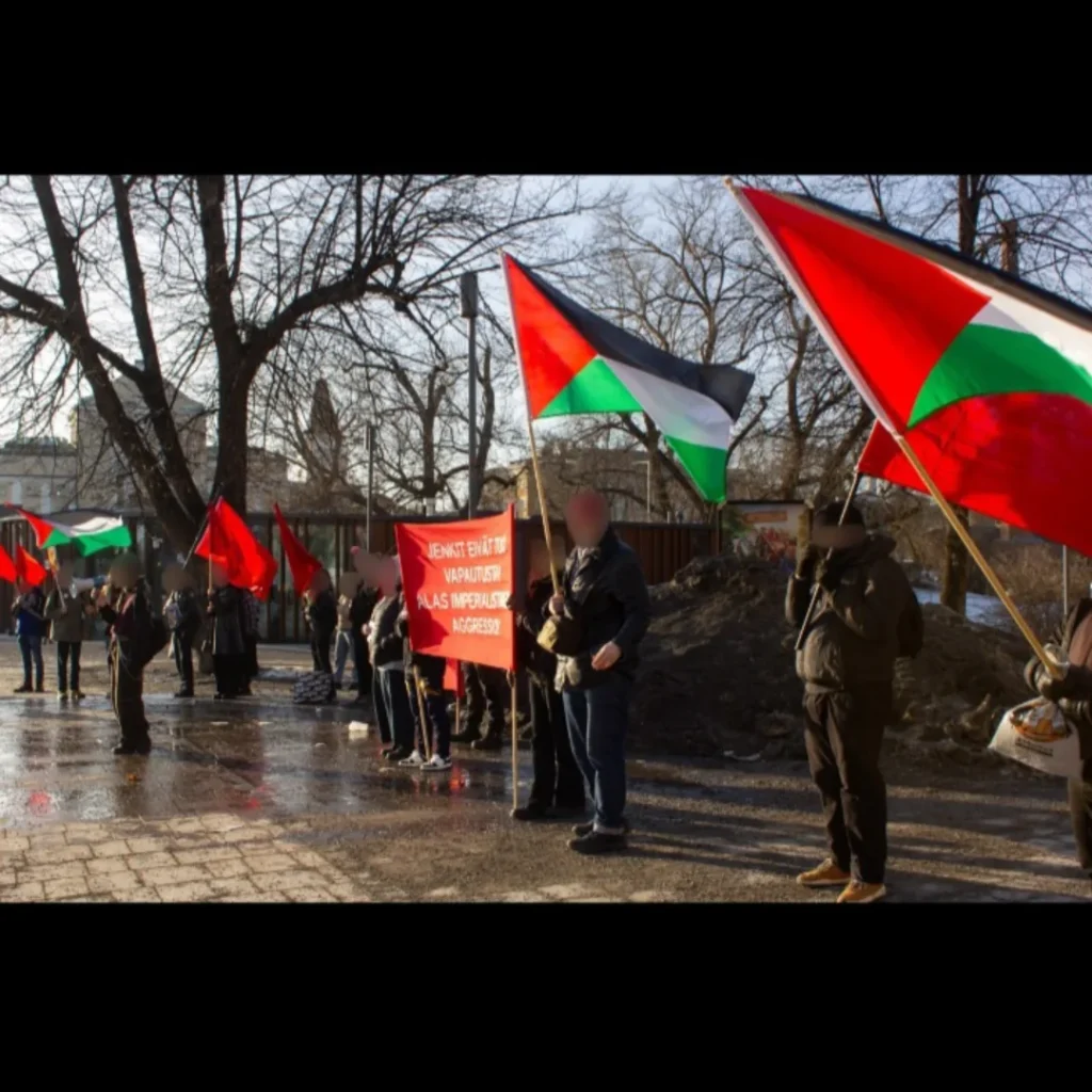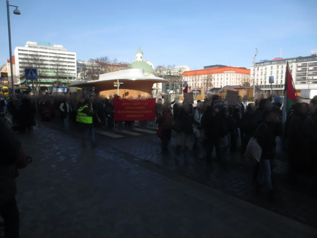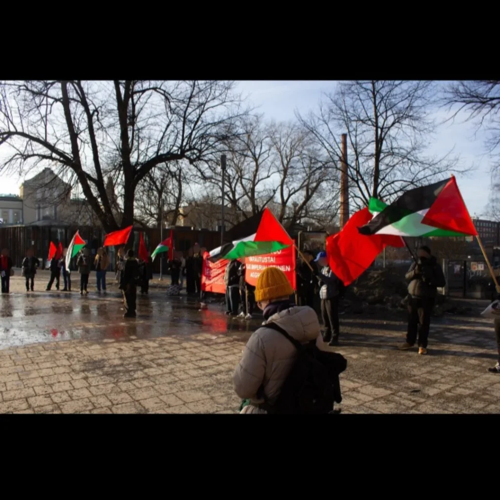 Lisäksi mielenosoituksen loppupuolella liityimme Palestiina-solidaarisuusliikkeeseen torjumaan pääministeri Petteri Orpon tilaisuudessa pitämän puheen. Orpon puhe hukkui Palestiinaa tukevien aktivistien kovaäänisiin huutoihin “Orpo, Orpo you can’t hide, you’re supporting genocide!”. Porvarillisten mediamonopolien tietojen mukaan pääministeriä kohti heitettiin lopuksi esine, minkä vuoksi hänet jouduttiin saattamaan lavalta.”