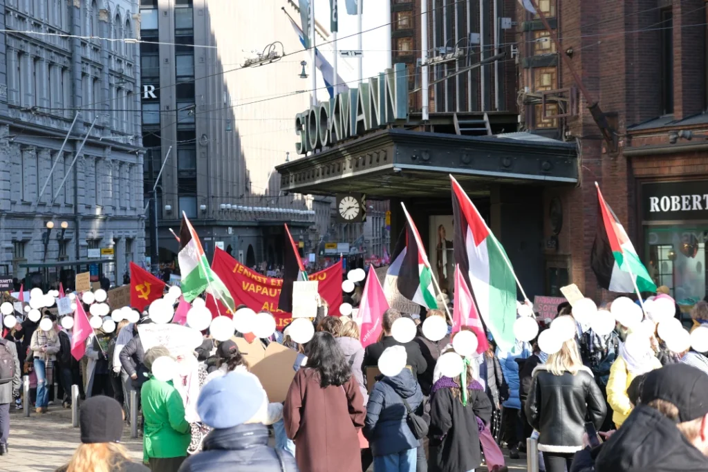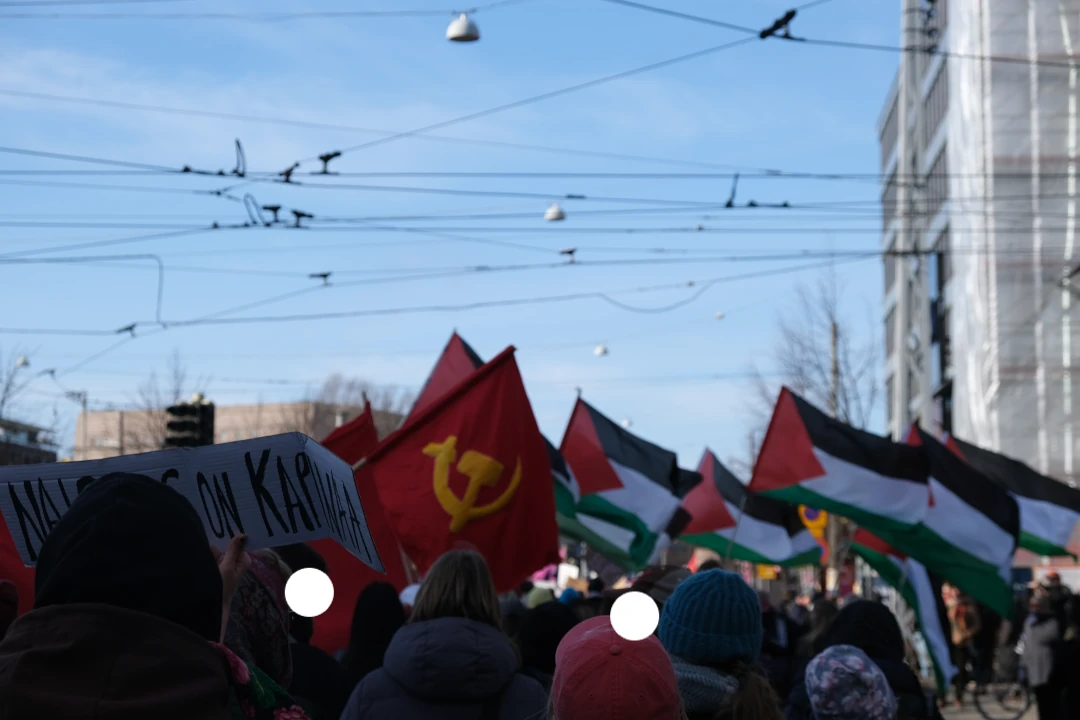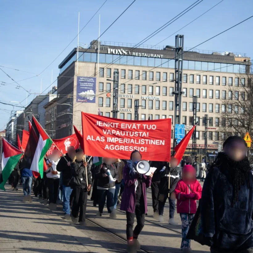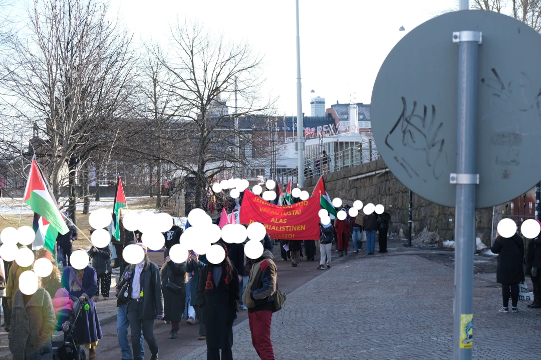 Lisäksi mielenosoituksen loppupuolella liityimme Palestiina-solidaarisuusliikkeeseen torjumaan pääministeri Petteri Orpon tilaisuudessa pitämän puheen. Orpon puhe hukkui Palestiinaa tukevien aktivistien kovaäänisiin huutoihin “Orpo, Orpo you can’t hide, you’re supporting genocide!”. Porvarillisten mediamonopolien tietojen mukaan pääministeriä kohti heitettiin lopuksi esine, minkä vuoksi hänet jouduttiin saattamaan lavalta.”