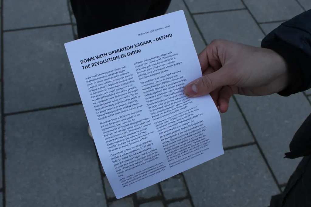 The Red Action organized a rally in Turku on the 28th of March against the genocidal operation Kagaar of the Indian old State. In the event, a speech was heard, in which the New Democratic Revolution in India was supported and the role of Finland in exploiting India was denounced.