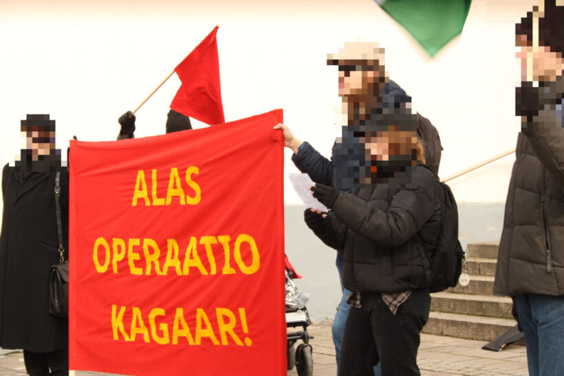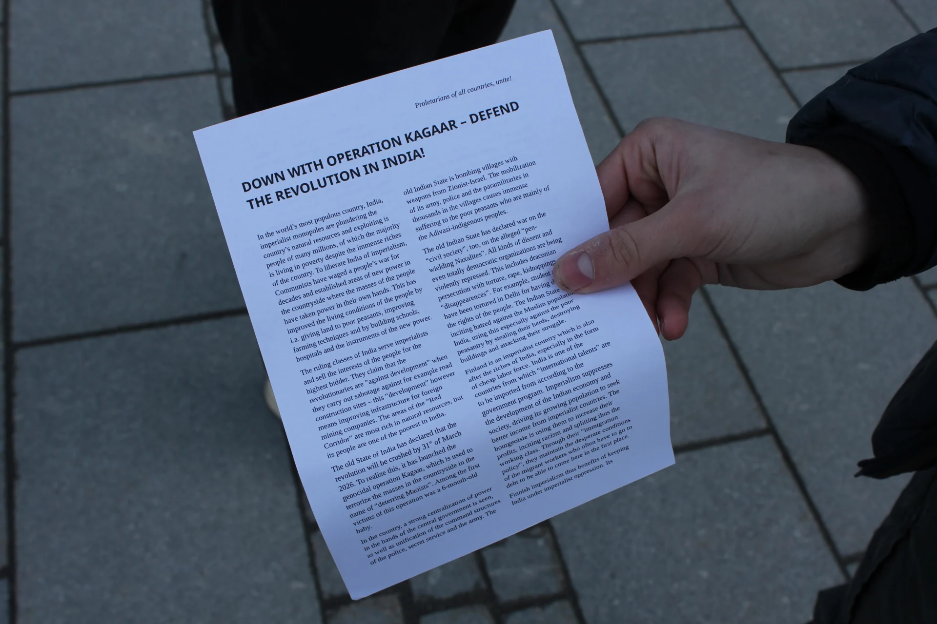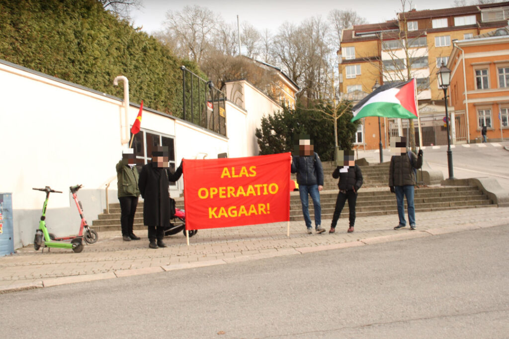 Slogans such as “Down with operation Kagaar! Long live the Indian revolution!”, “The reaction is bound to lose, the people of India will triumph!”, “Finland out of India!” and “Found the international Anti-imperialist League!” were shouted.