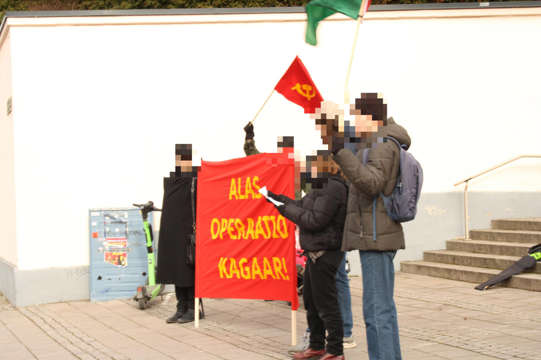 Lisäksi kuultiin huutoja kuten ”Alas operaatio Kagaar! Eläköön Intian vallankumous!”, ”Taantumus häviää, Intian kansa voittaa!”, ”Suomi ulos Intiasta!” ja ”Perustakaa kansainvälinen Anti-imperialistinen Liitto!”.