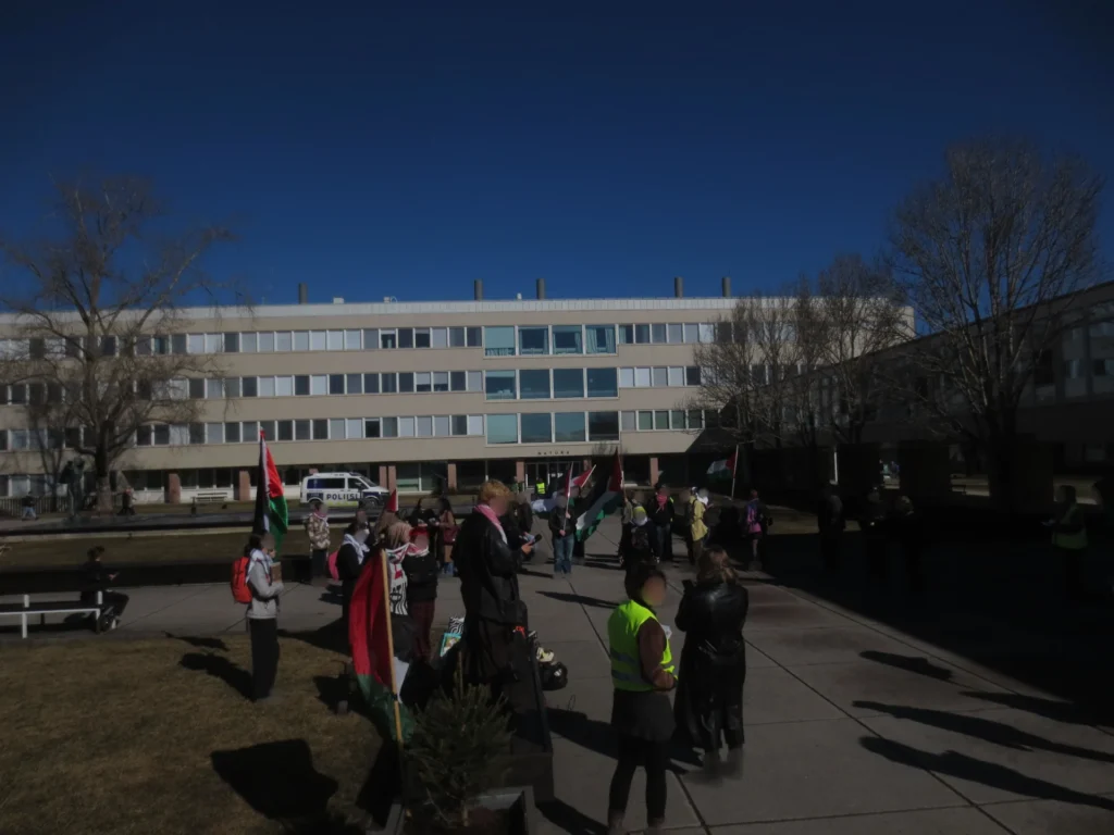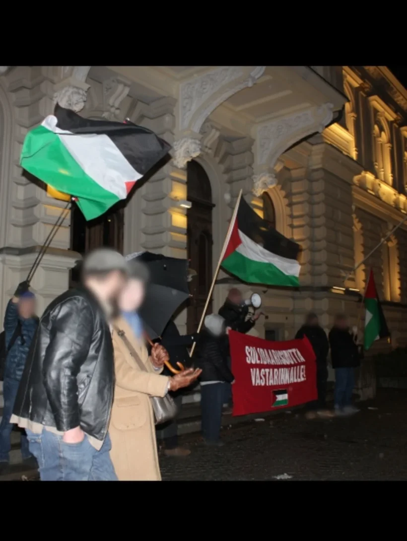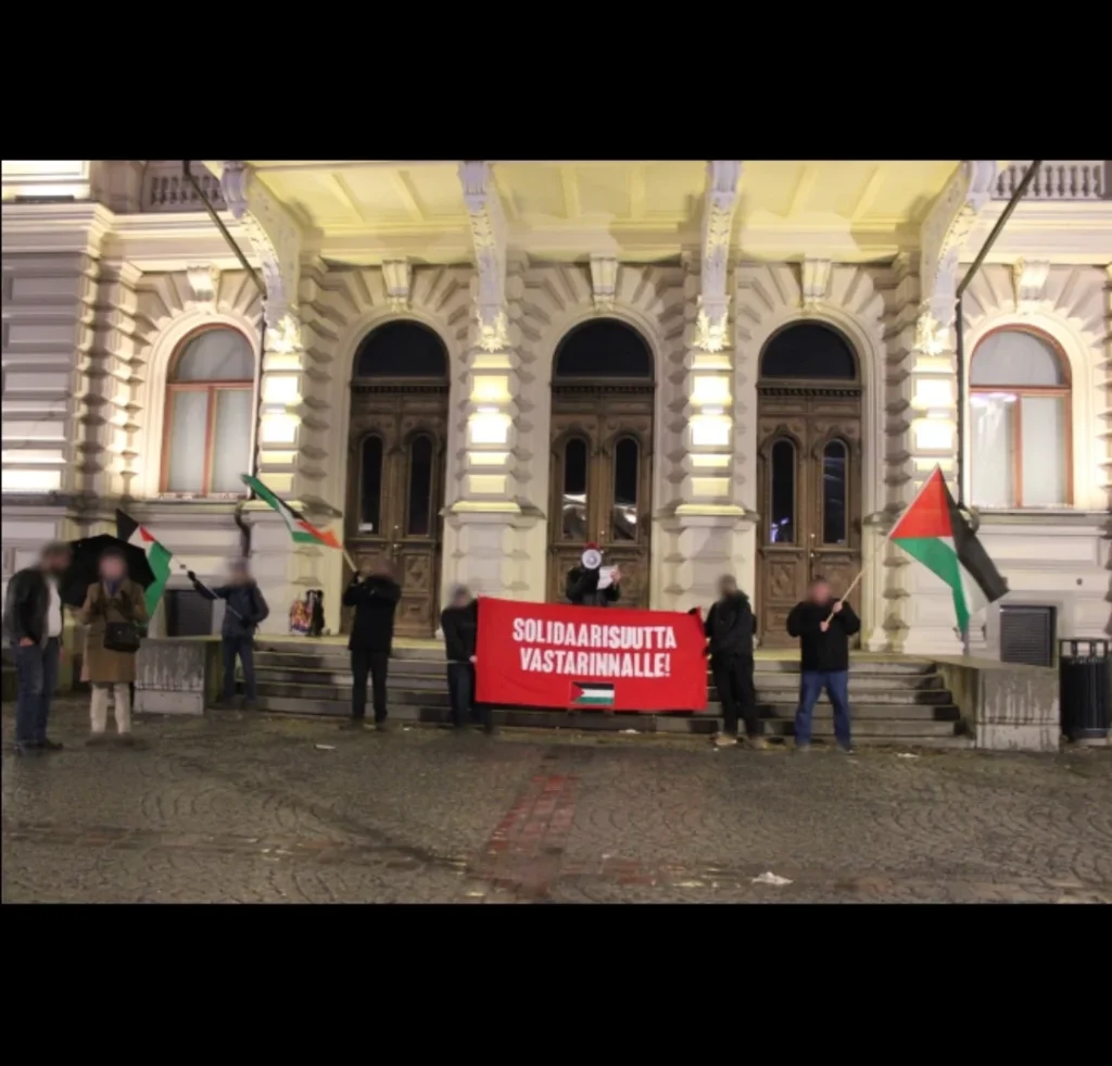 ”Sunnuntai-iltana (15.3.) ryhmä anti-imperialisteja osoitti mieltä Tampereen Raatihuoneella Kansainvälisen Al-Quds -päivän johdosta. Puheessa osoitimme solidaarisuutta Palestiinan kansalle ja sen vastarinnalle, huomioiden sen, kuinka jenkkien-sionistien hyökkäyssota Iranin alistamiseksi nojaa yhdeltä puolen Palestiinan miehitykseen. Huomioimme myös Palestiina-solidaarisuusliikkeen keskinäisen solidaarisuuden tarpeen repression edessä – esimerkiksi, brittipoliisi oli kieltänyt Al-Quds -päivän marssin samana sunnuntaina Lontoossa.